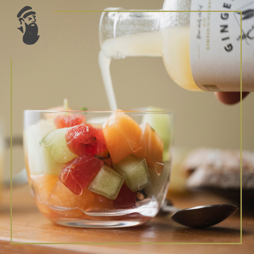 Ginger Jack, verse fijne stukjes fruit en verse muntblaadjes.