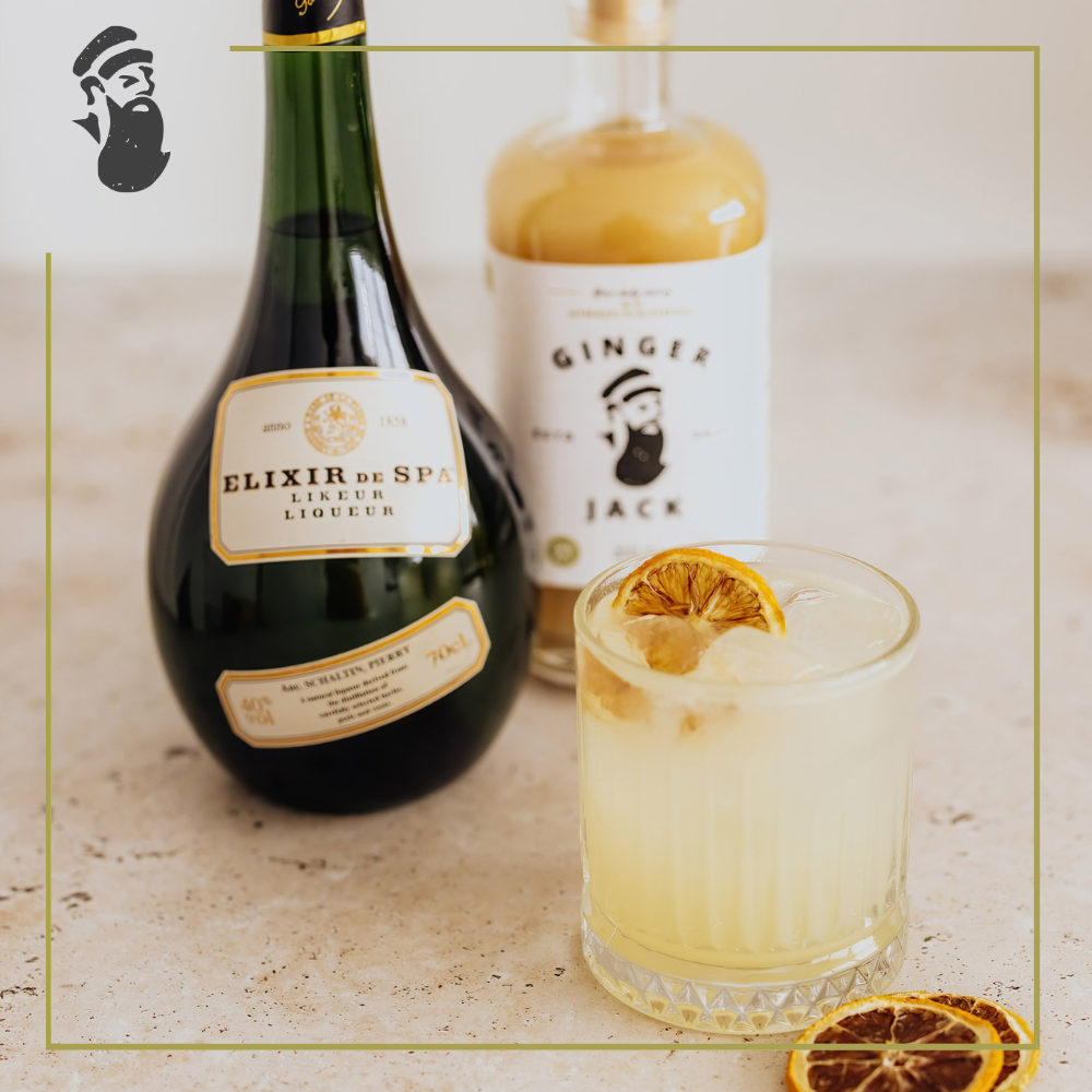 20 ml Ginger Jack, 70 ml Elixir de Spa, 20 ml vers limoensap, spuitwater, ijsblokken en eventueel een gedroogd limoenschijfje.