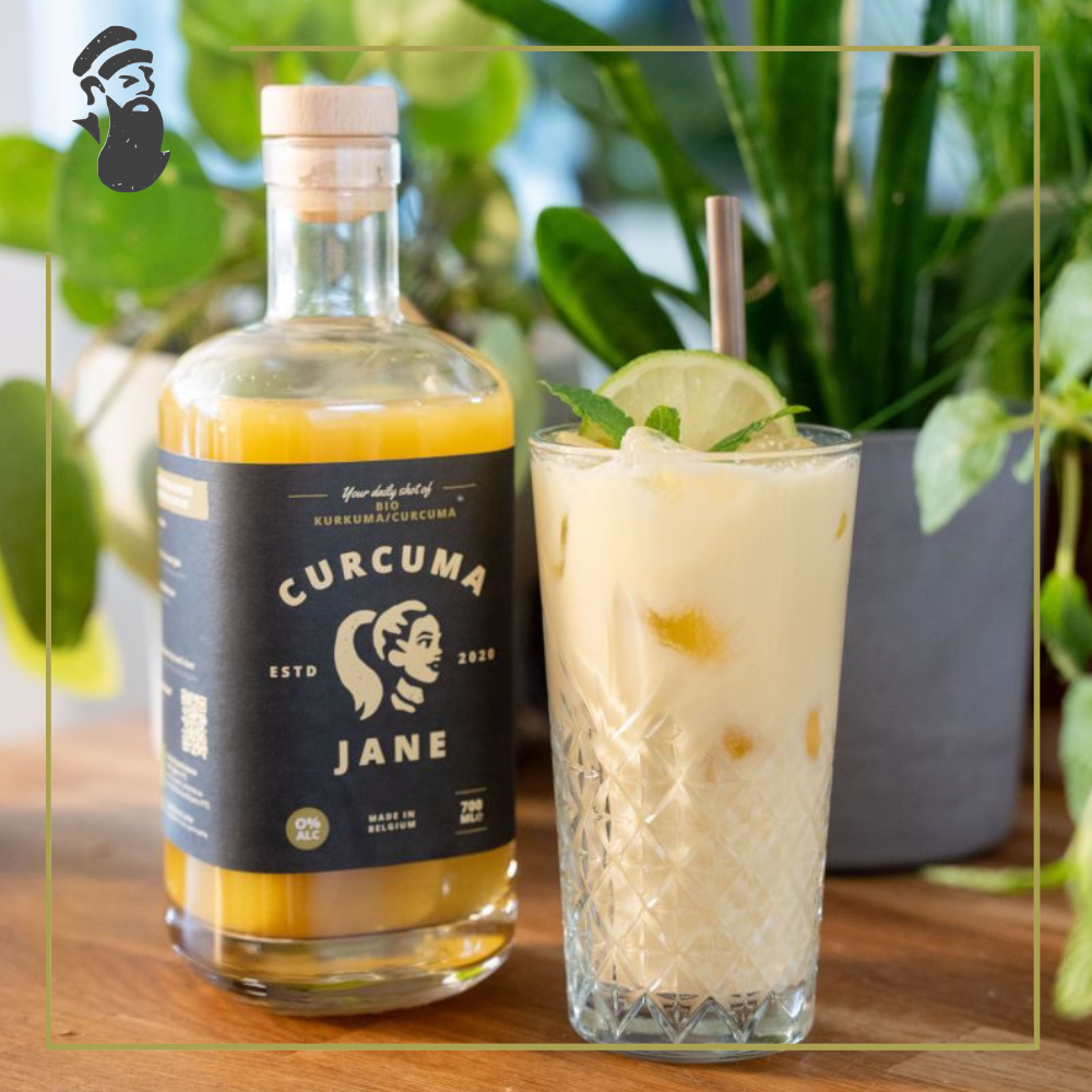 45 ml Curcuma Jane, 150 gr yoghurt, 30 ml limoensap, 1 mango (in blokjes en bevroren), 150 ml water, 1 el suiker, een snuifje zout, een snuifje kardemom, ijsblokken, een takje munt en een schijfe limoen.